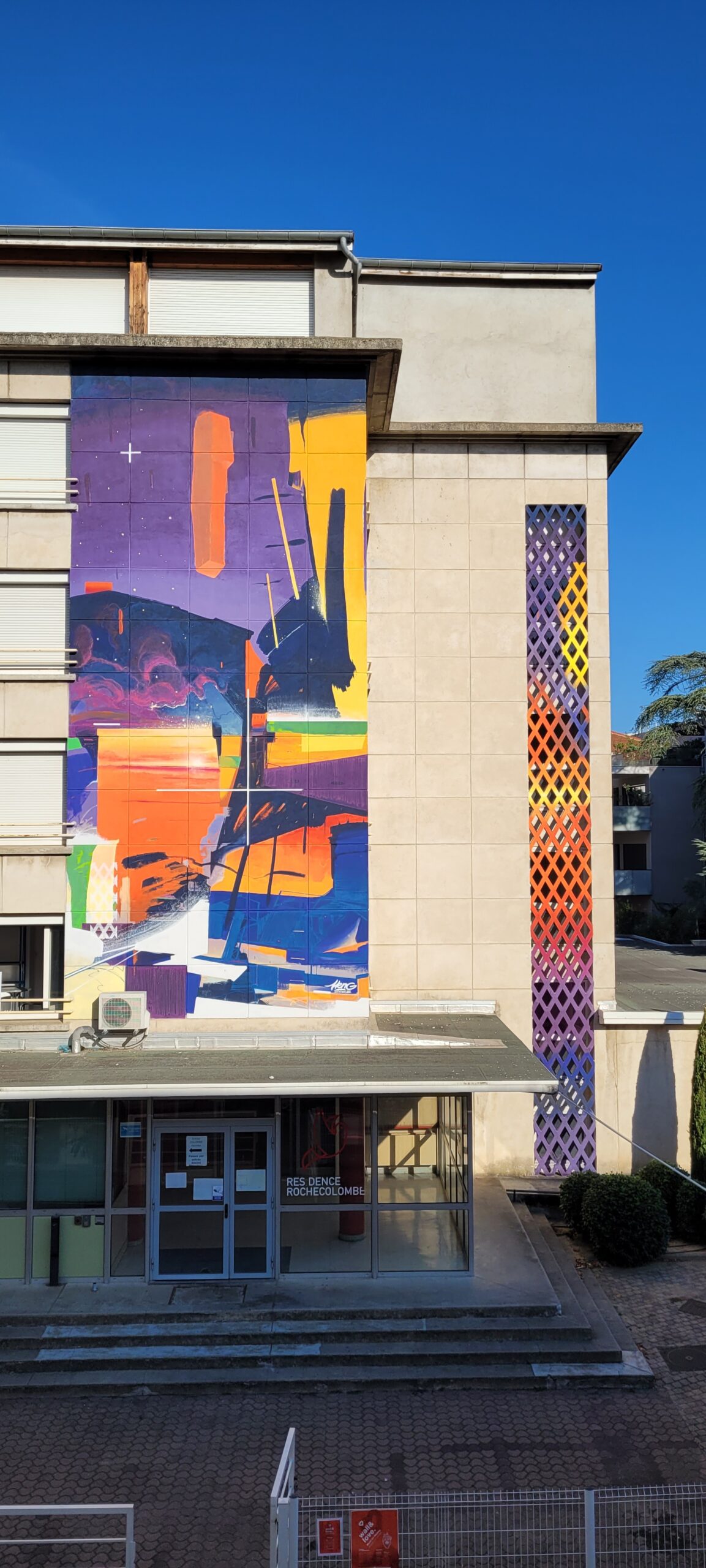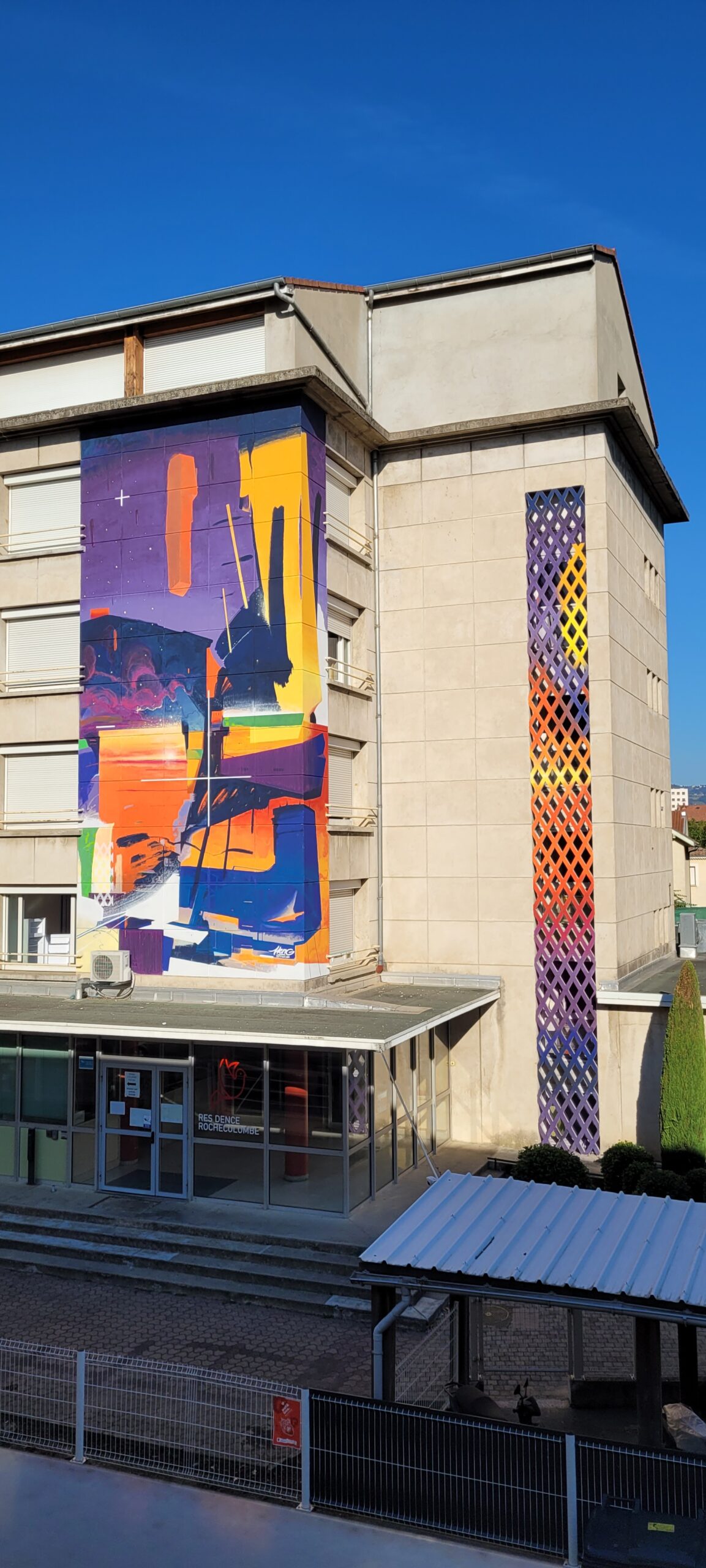 Pour le projet Crossing Lines, l’artiste a souhaité extérioriser la vie joyeuse et multiculturelle de la résidence Rochecolombe, foyer de jeunes travailleurs appartenant à l’association du Diaconat Protestant de Valence et qui héberge plus de 20 nationalités différentes en ses murs.